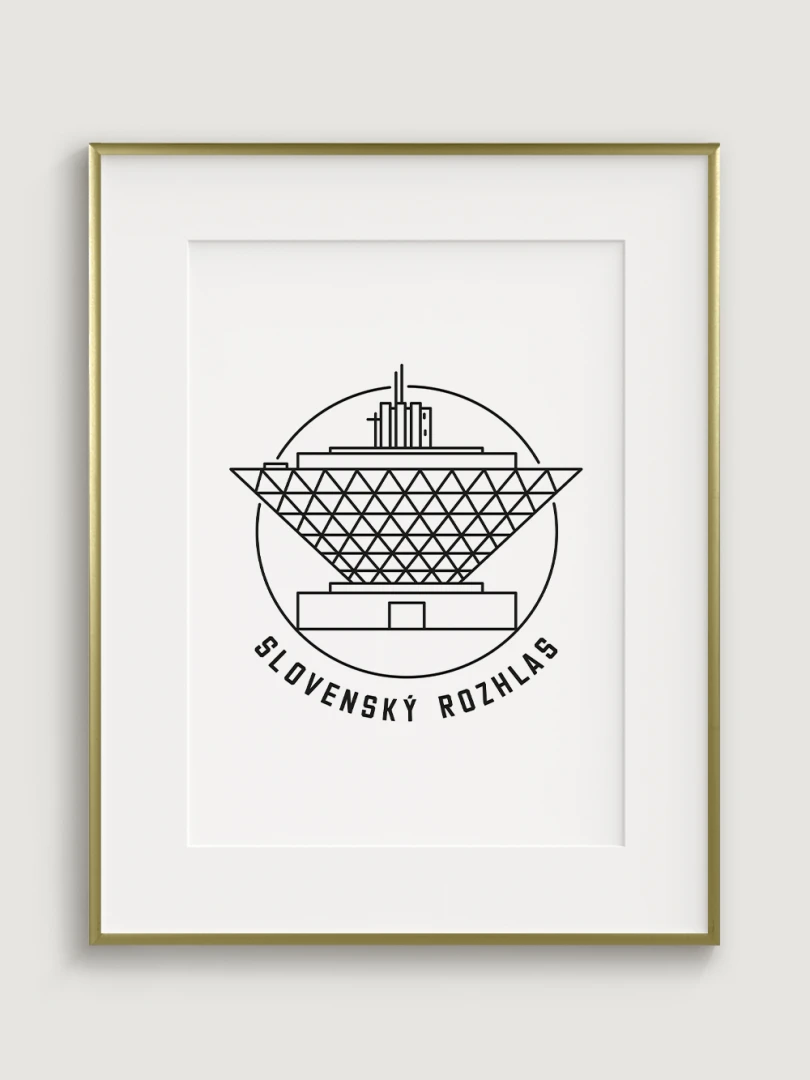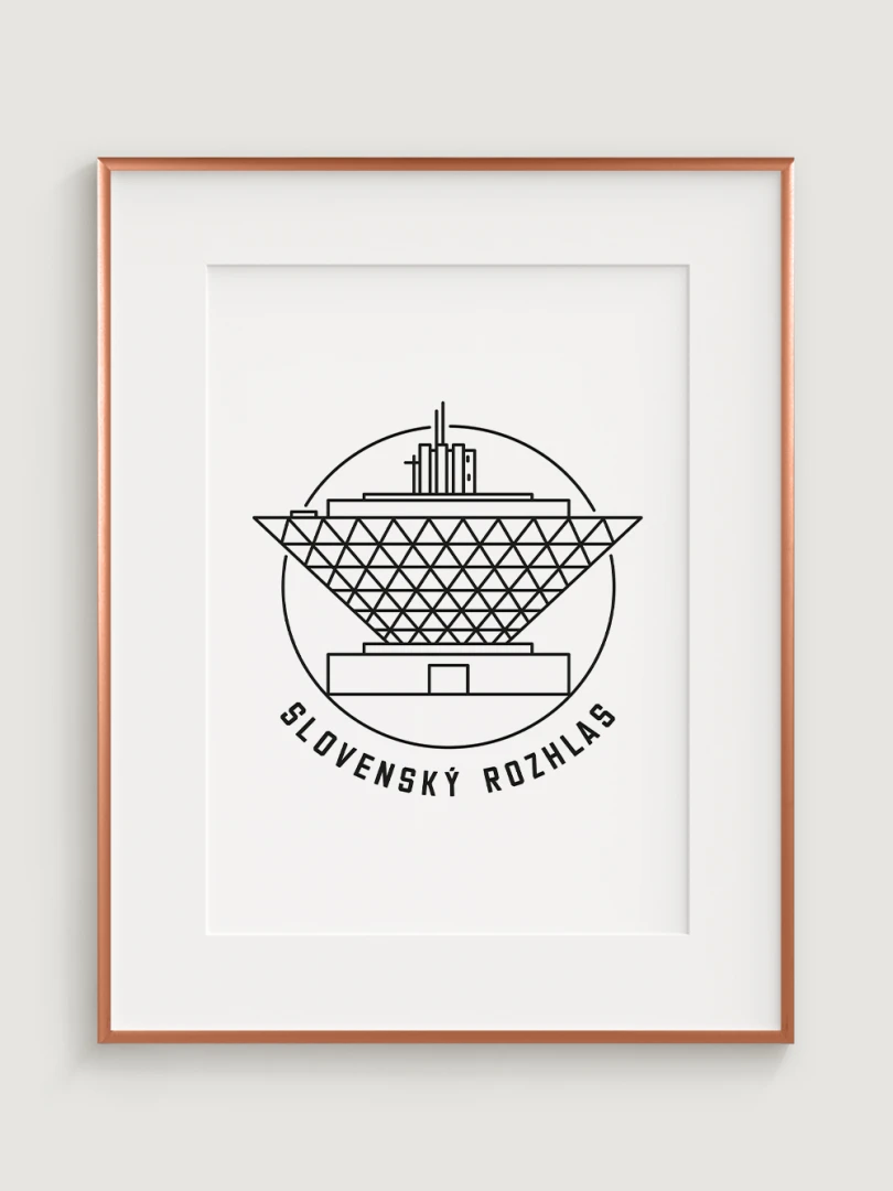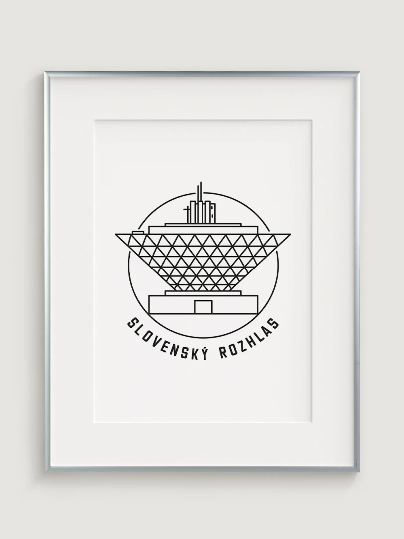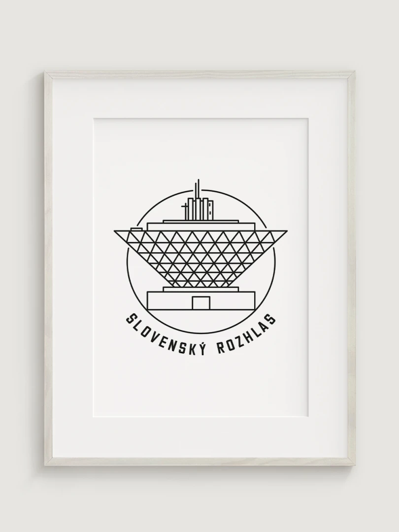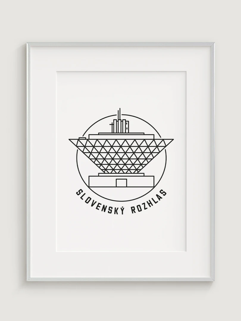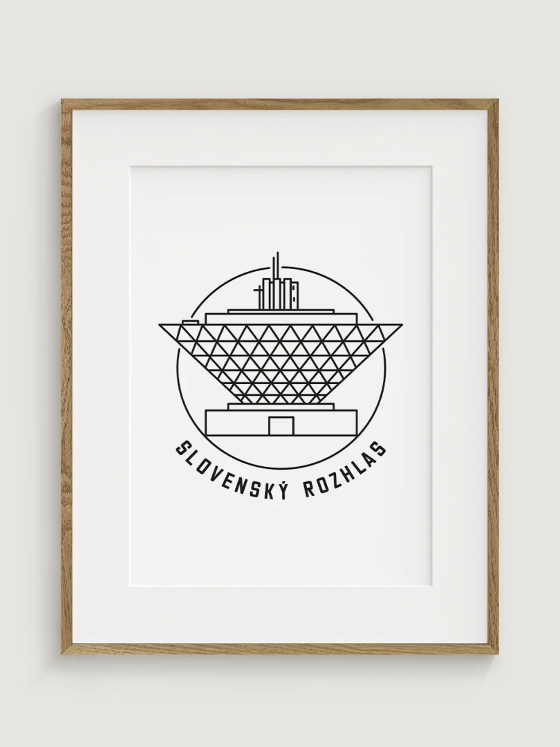 This piece artistically represents the Slovak Radio building, renowned for its unique inverted pyramid structure. Through a clean and precise line design, this illustration highlights the building's distinct architectural features encased within a circular frame, adding a geometric aesthetic that complements any modern decor.