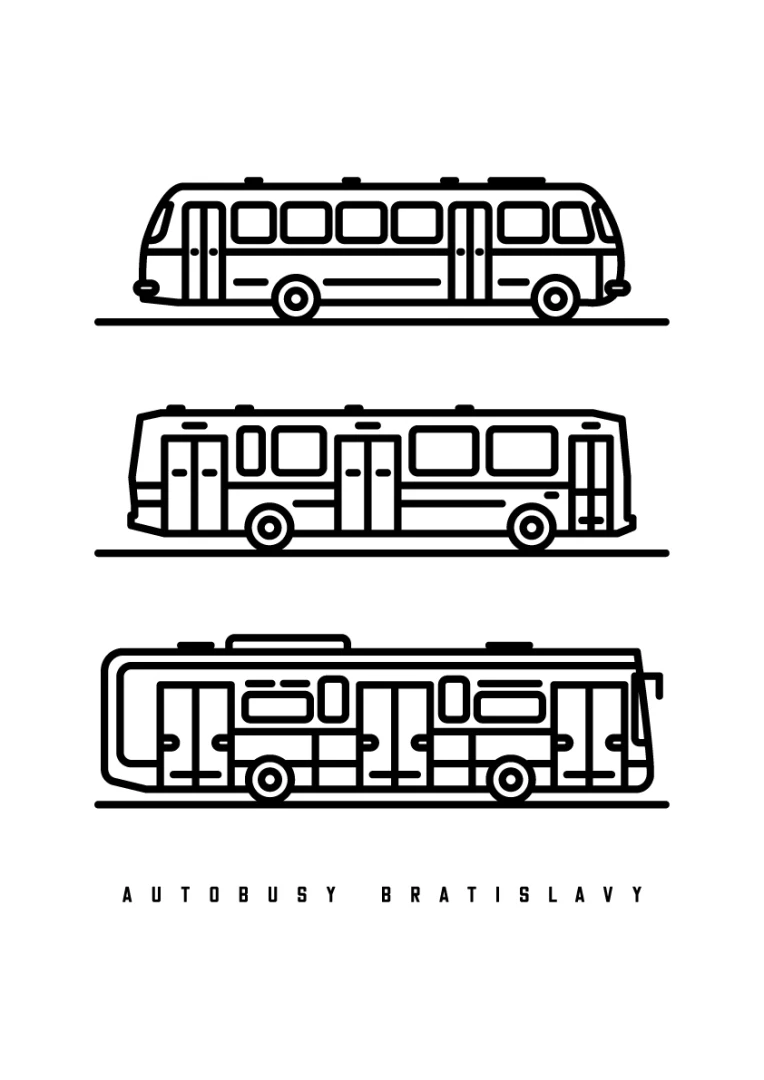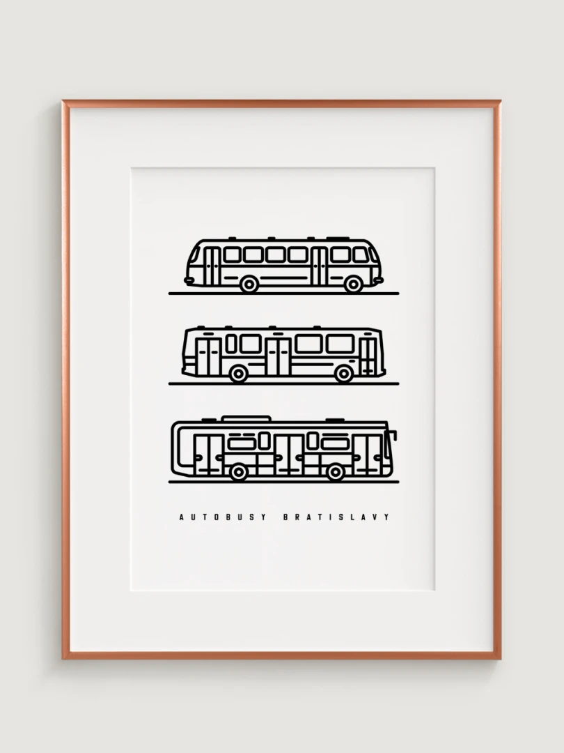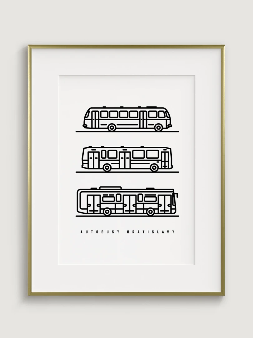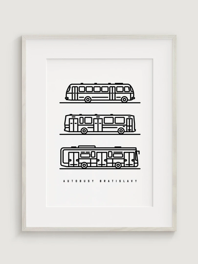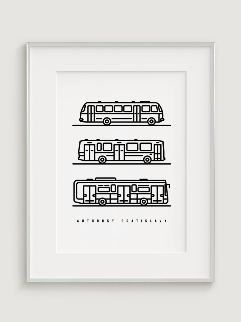 This visually striking print features a trio of iconic Bratislava buses: the ŠKODA 706 RTO MTZ, the KAROSA B731.00, and the IVECO URBANWAY 10.5M.Each bus is depicted in a minimalist line drawing style that captures the essence of urban transport. This art piece is not only ideal for transport fans, but also for lovers of clean and minimalist design.