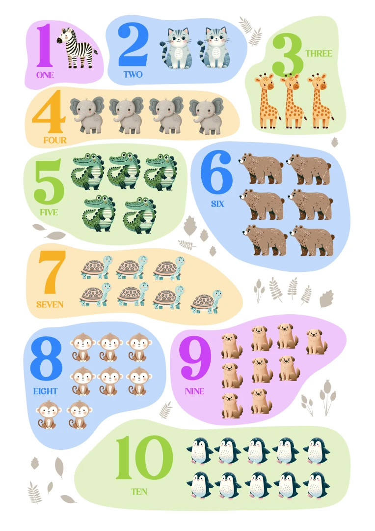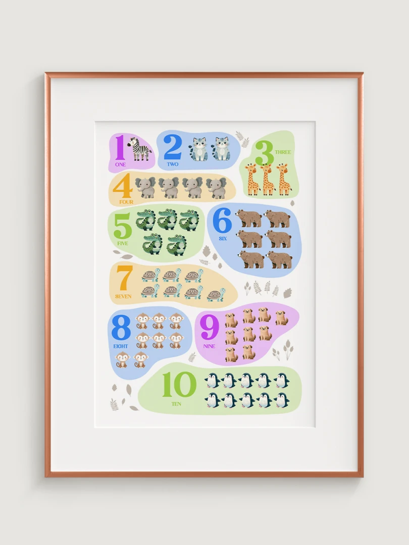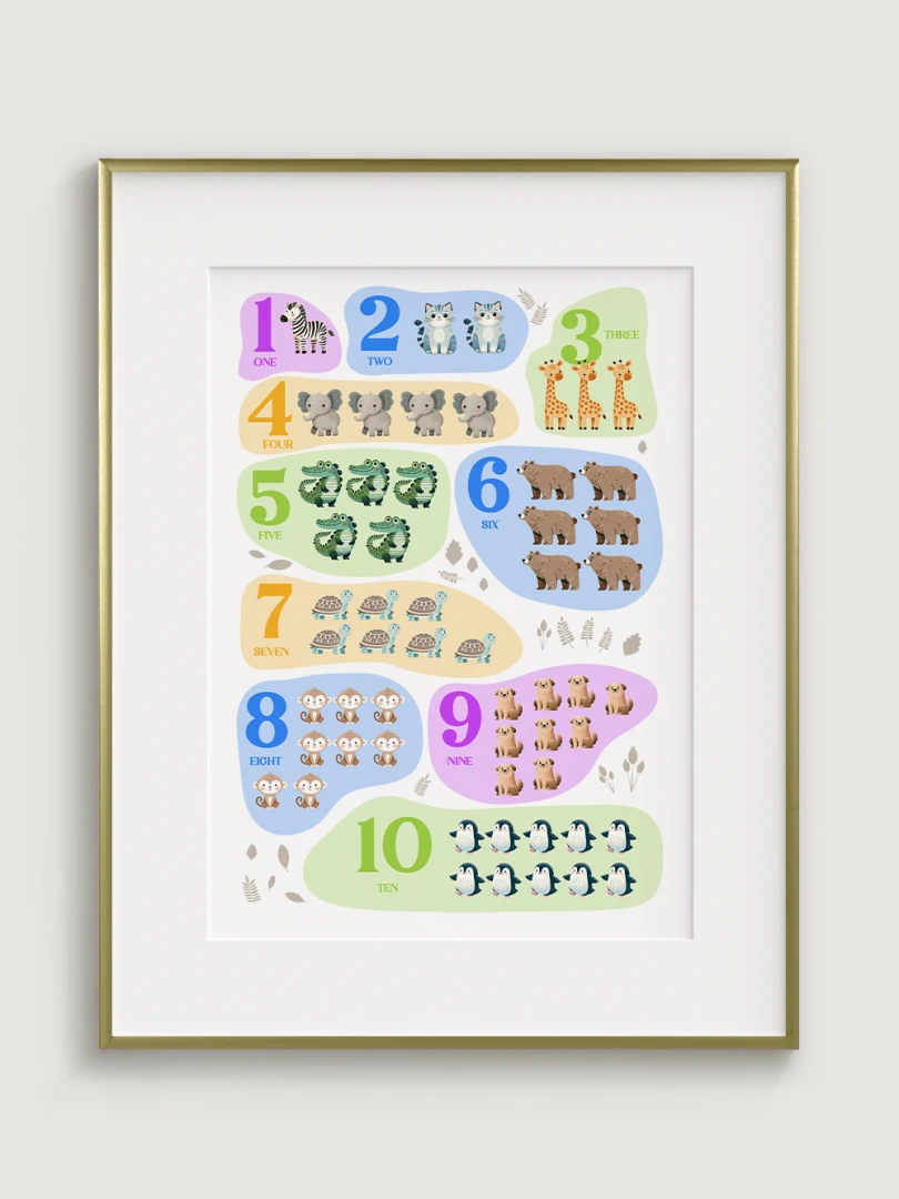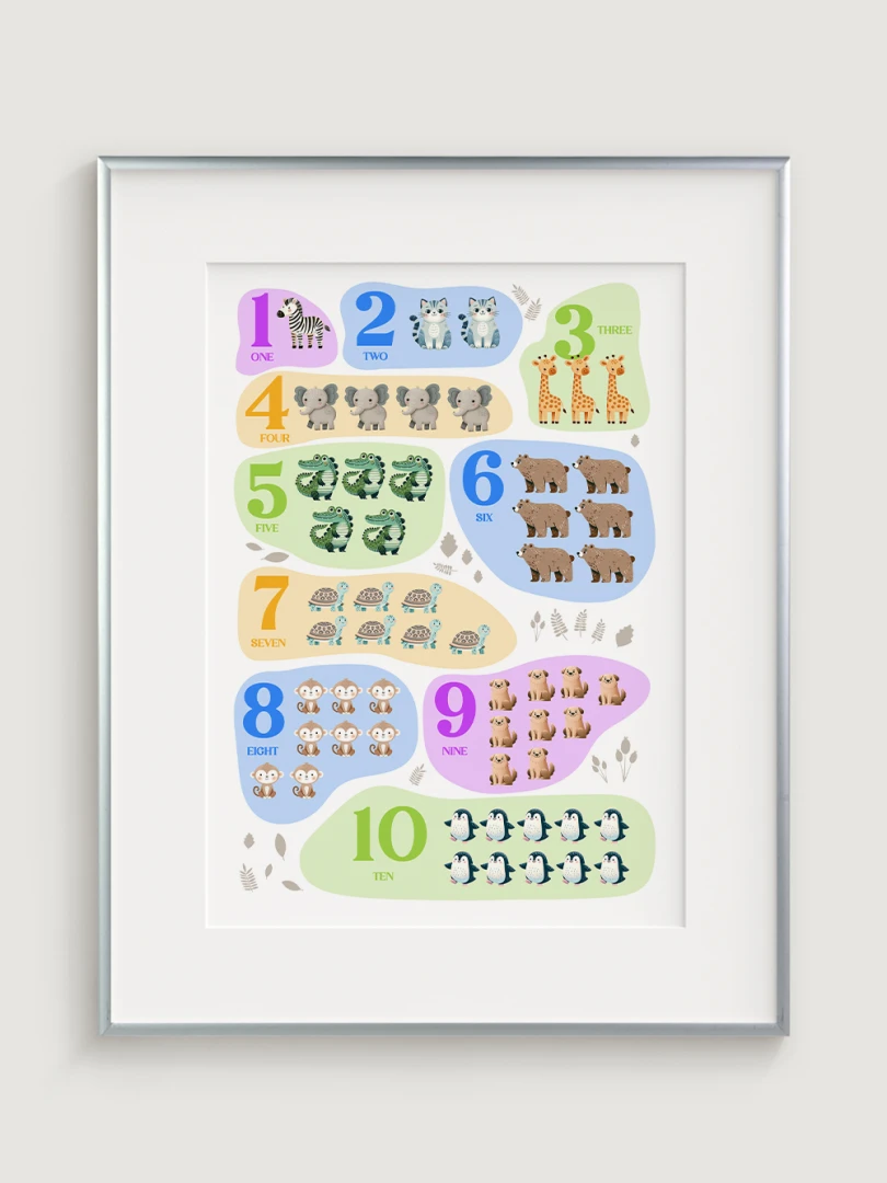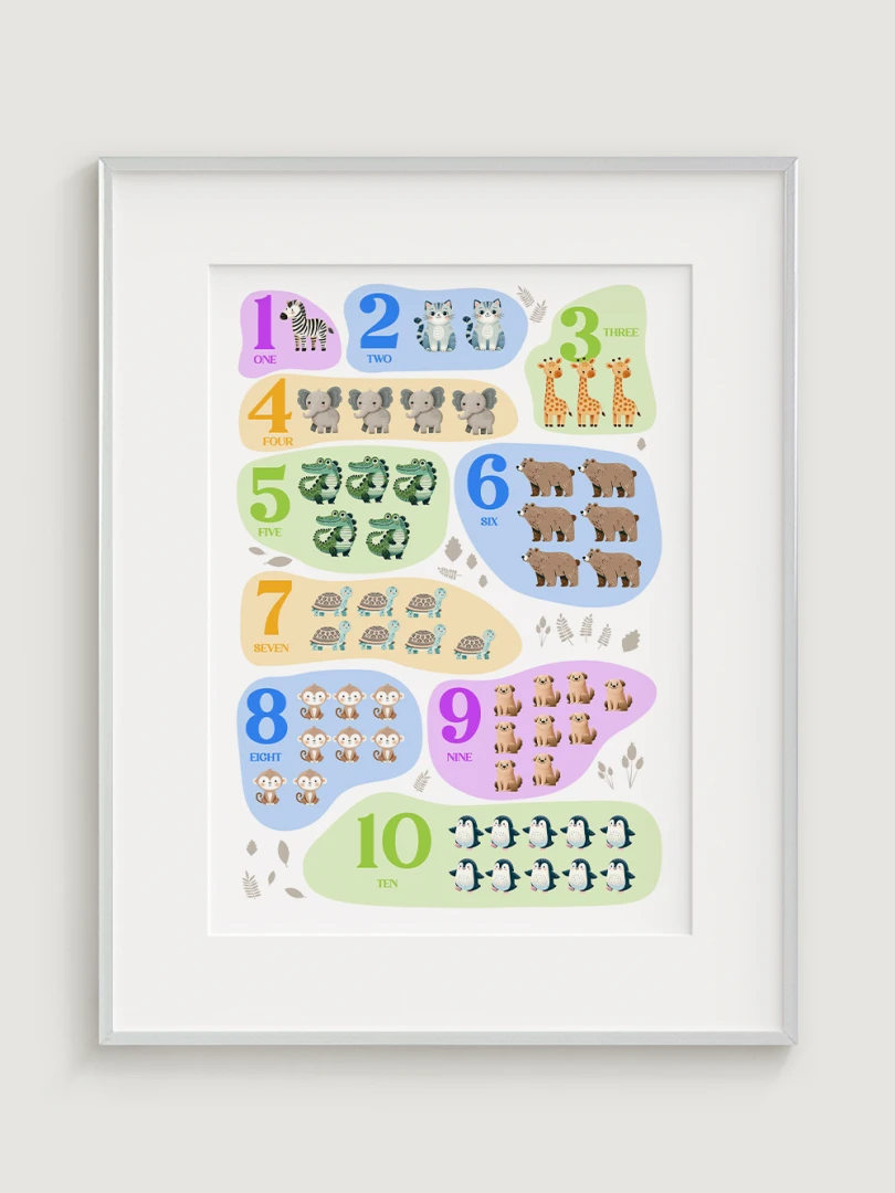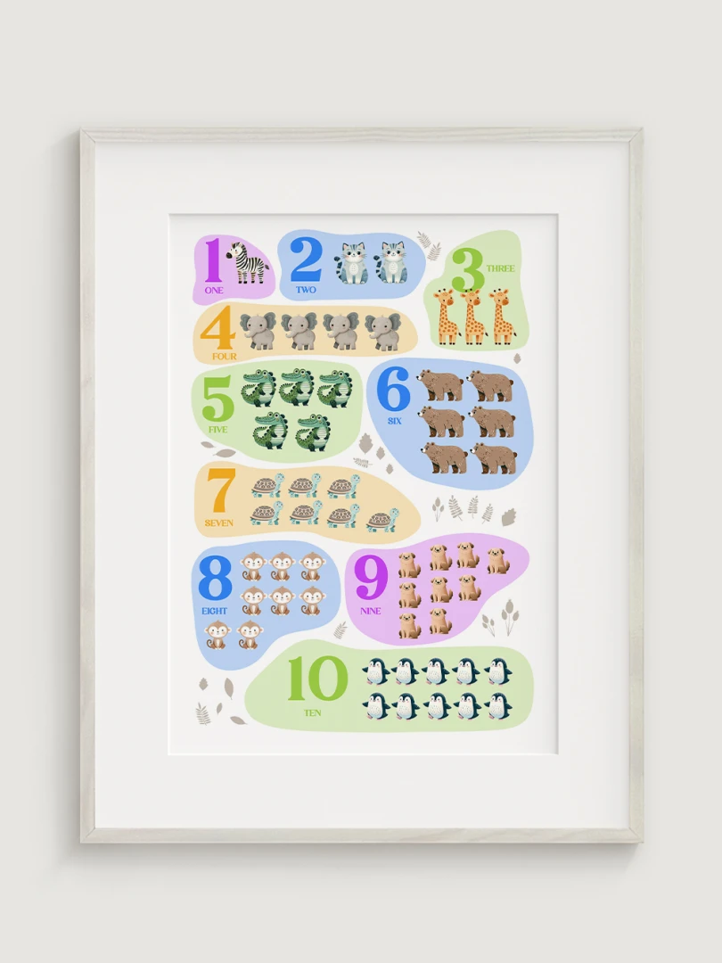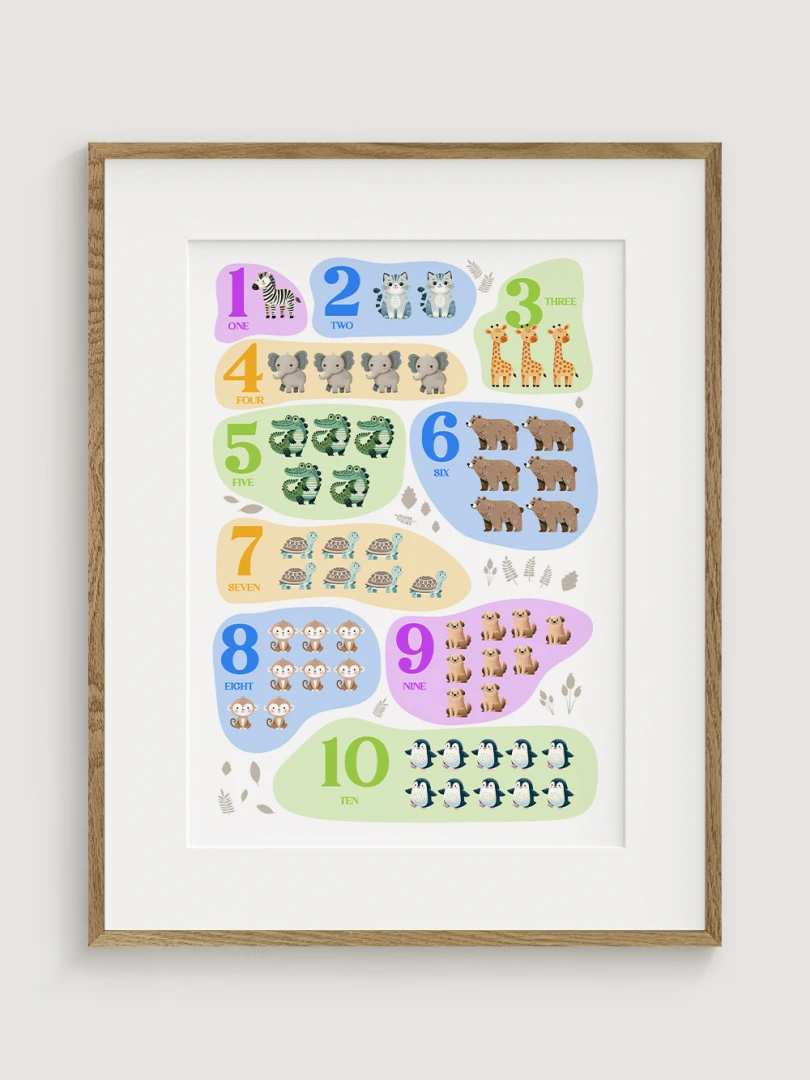 This charming and colorful illustration features numbers from 1 to 10, each paired with adorable animals to help children learn counting in an engaging and enjoyable way. Each number is represented by a different animal, making it a delightful educational tool. Printed on high-quality paper with vibrant colors, this print not only serves as a wonderful learning aid but also adds a bright and cheerful touch to any nursery, playroom, or child’s bedroom.