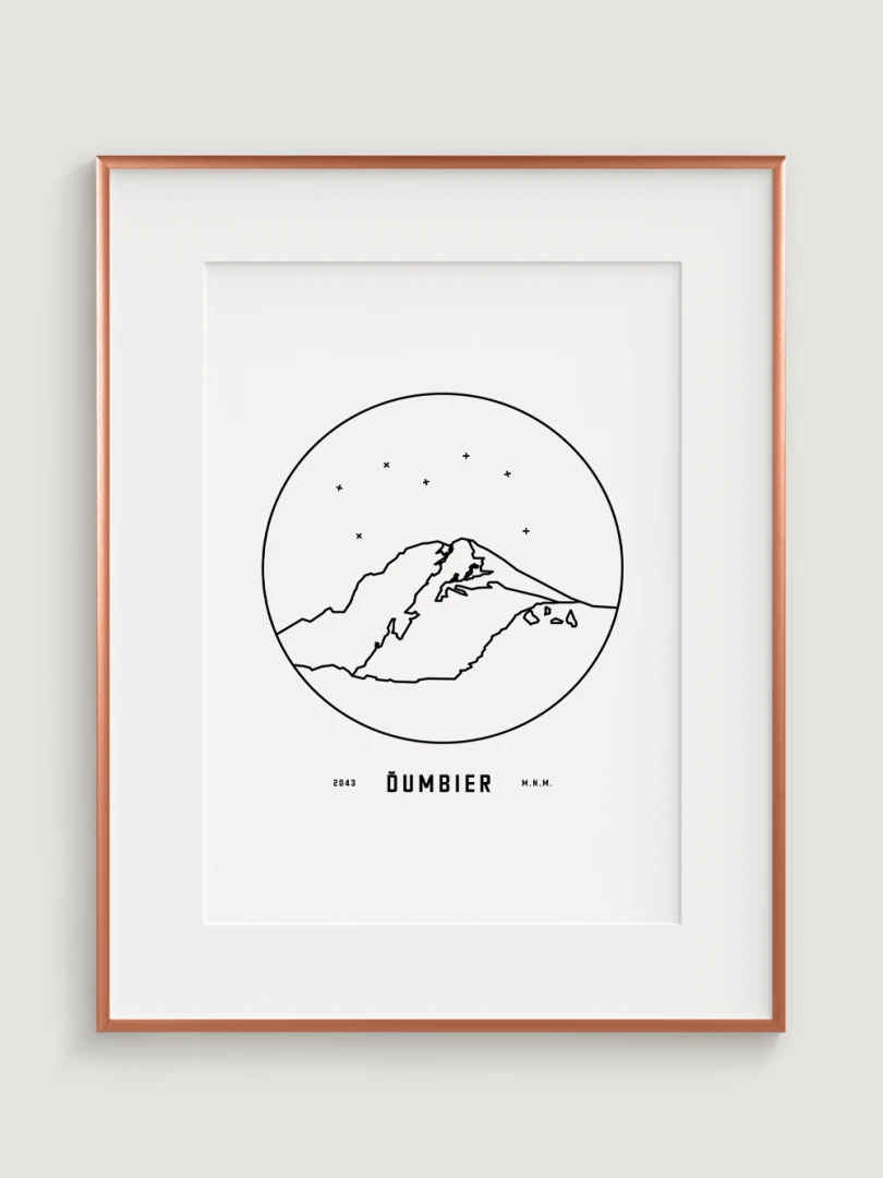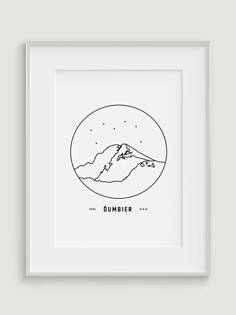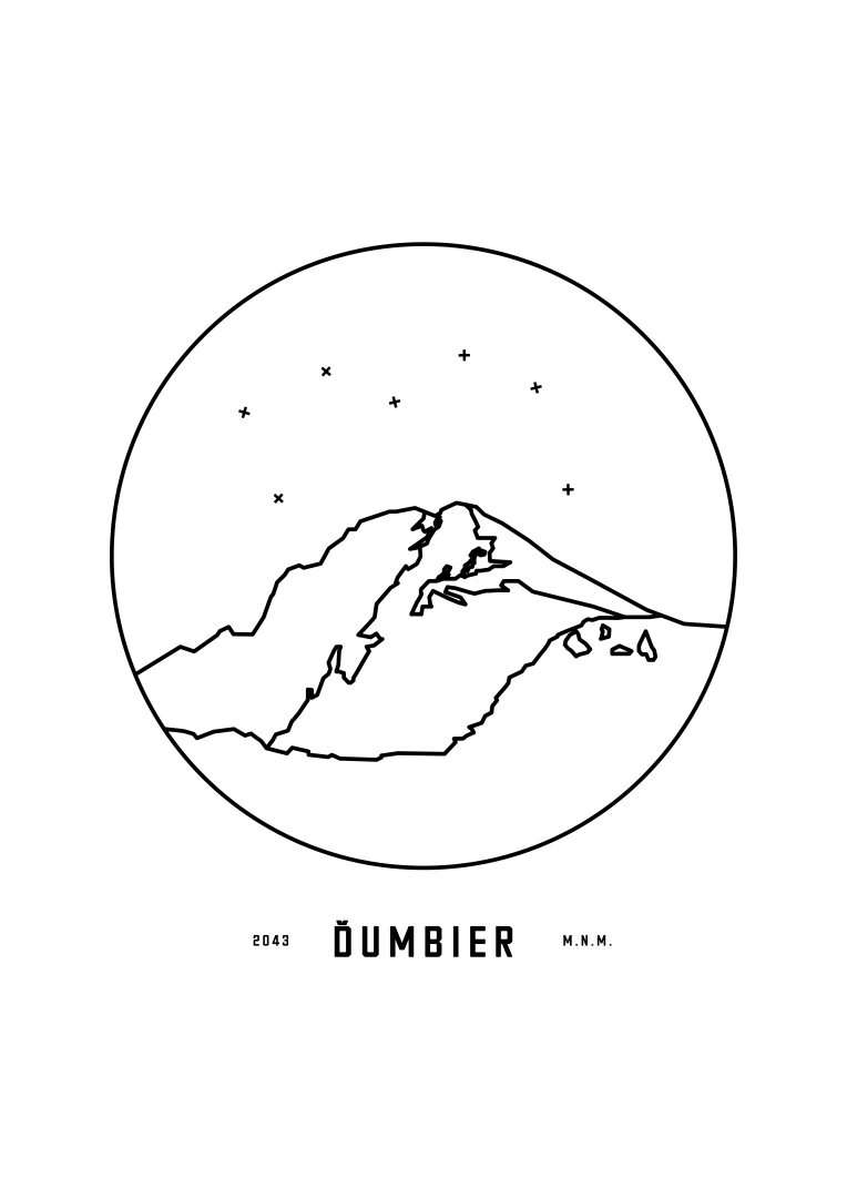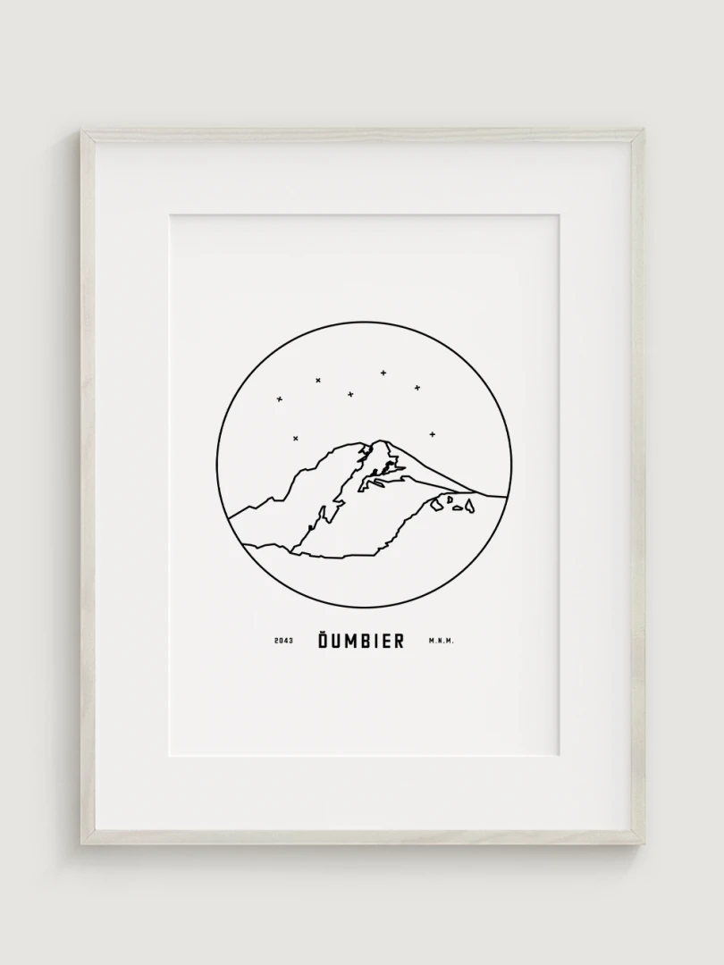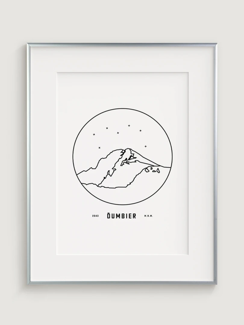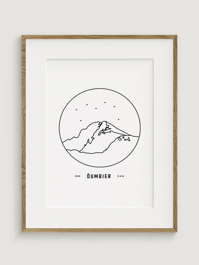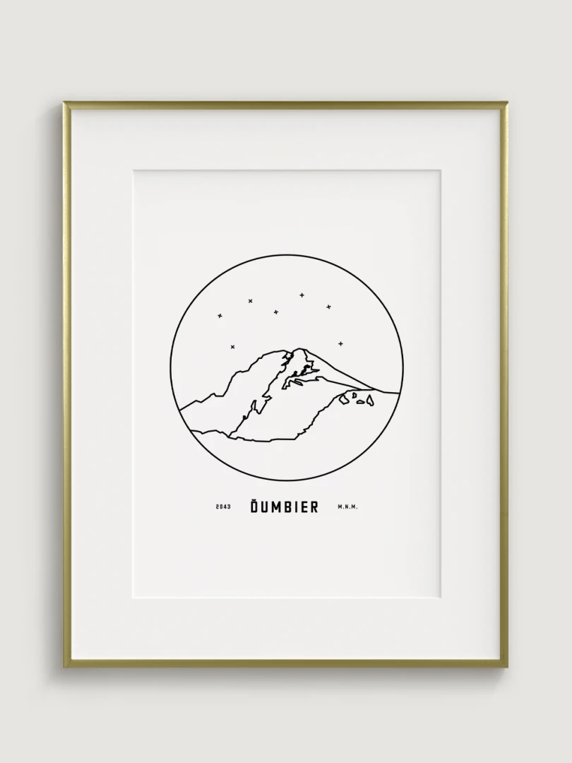 Mount Ďumbier is depicted in a detailed circular vignette with its name and elevation, creating a unique and aesthetically pleasing addition for nature and mountain lovers. This print is an ideal gift for those who want to bring home a piece of the Slovak landscape and the majesty of its peaks.