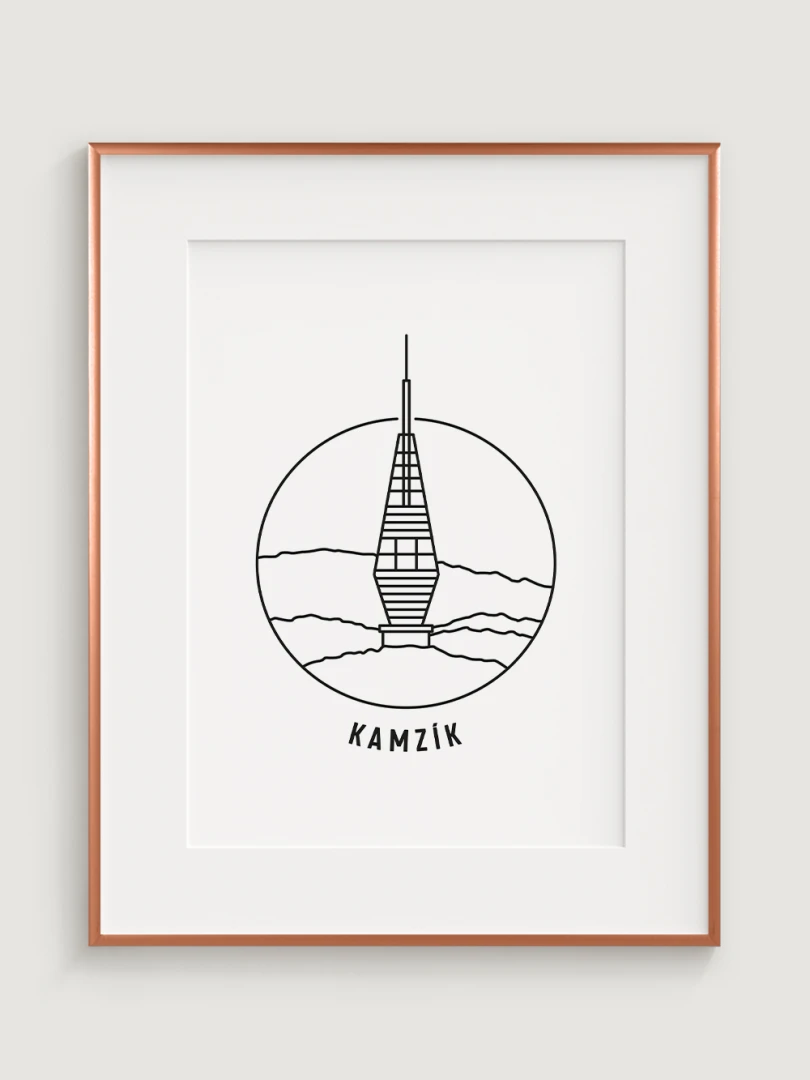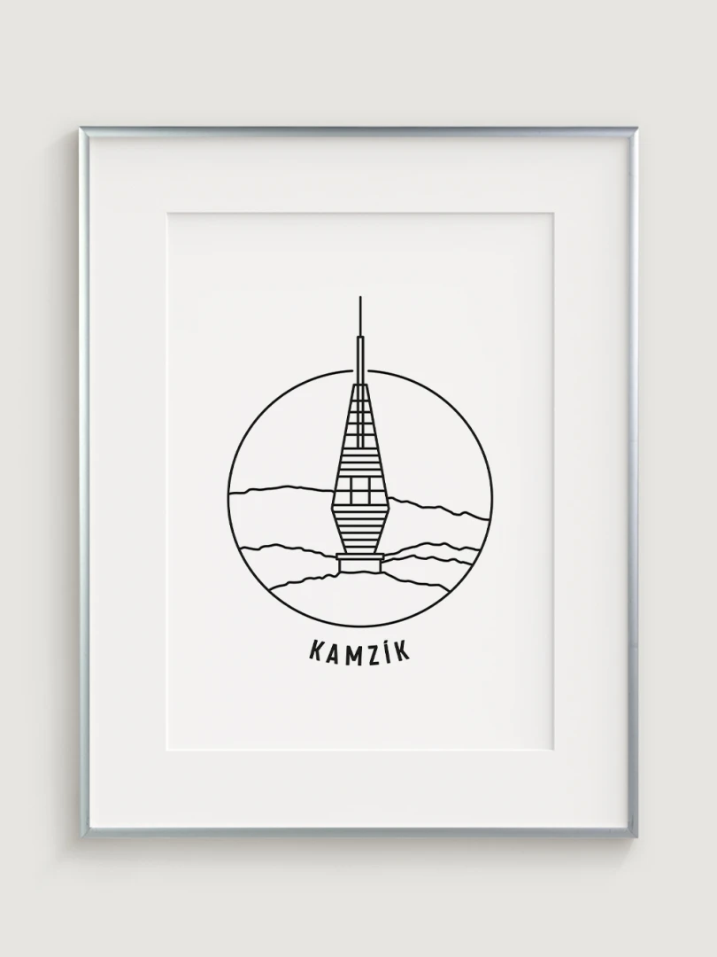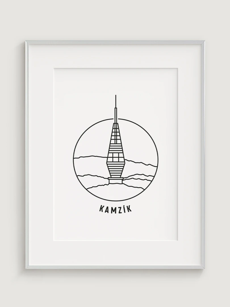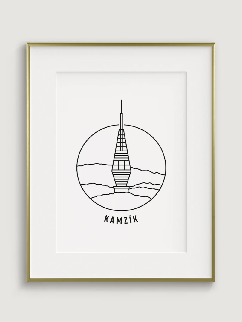 This piece captures the distinctive structure of the tower, set against the rolling hills that surround it, all enclosed within a simple circular border that focuses the viewer's attention on the iconic design.Whether for your home, office, or as a gift, this artwork brings a piece of Bratislava's contemporary architecture into any space in an understated yet striking manner.