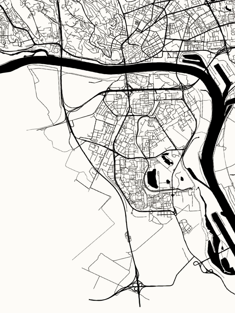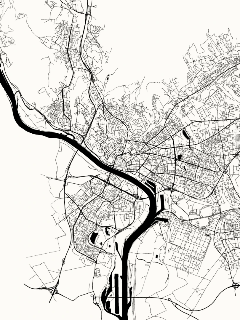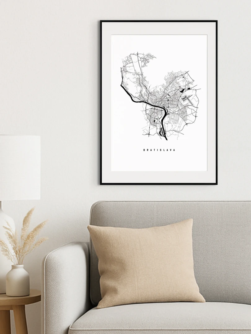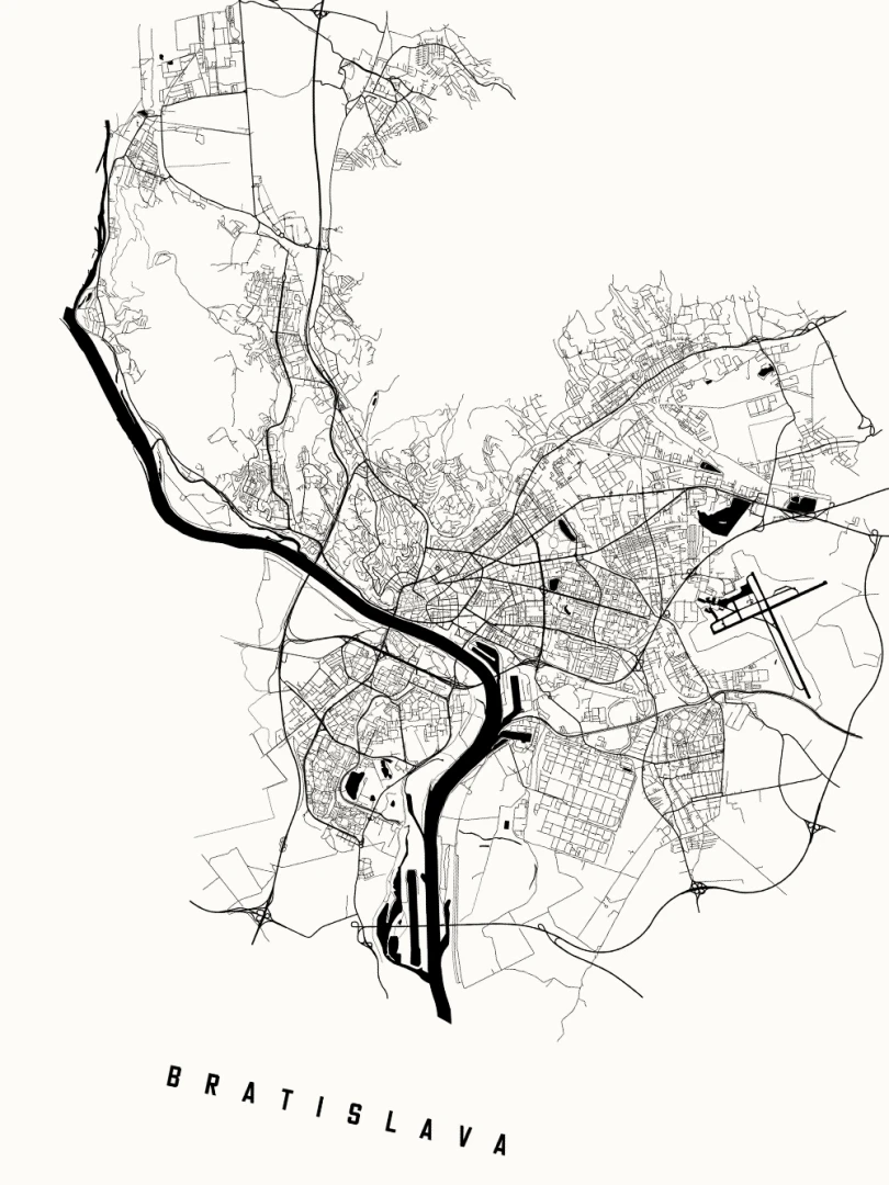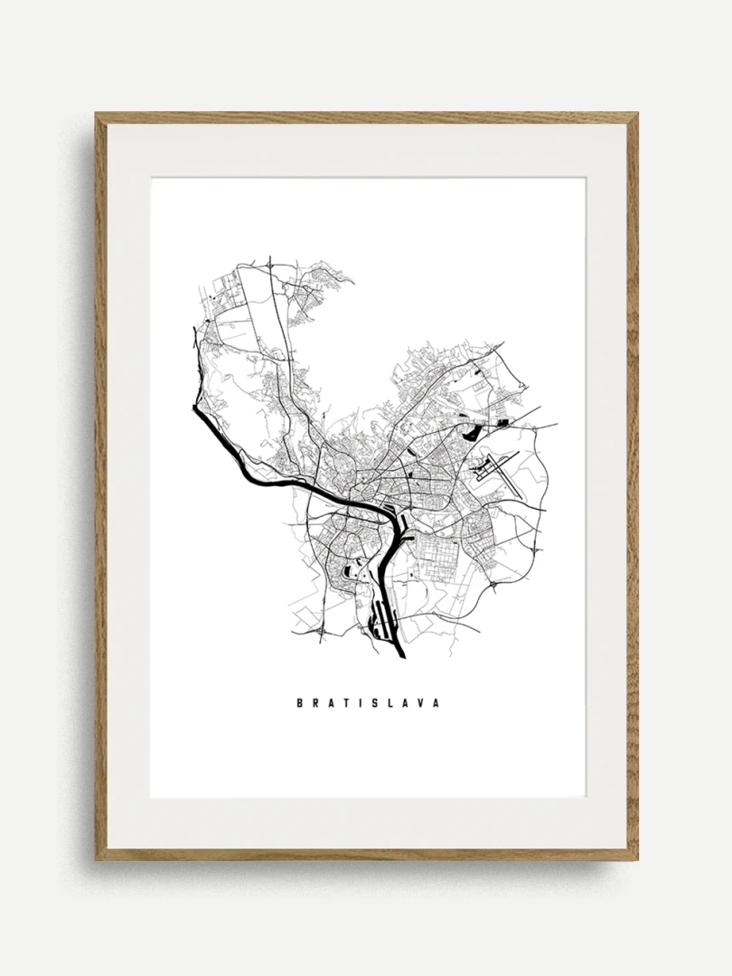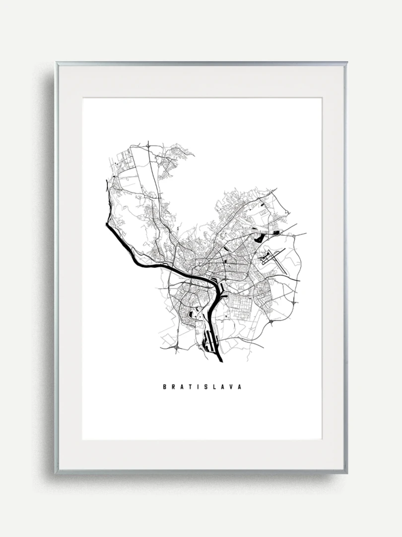 This print features a meticulously detailed map, showcasing the complex street patterns and geographical contours that define Slovakia's capital. Rendered in a crisp, black ink on high-quality paper, the design combines aesthetic appeal with informative precision, making it a perfect blend for both art enthusiasts and cartography aficionados.
