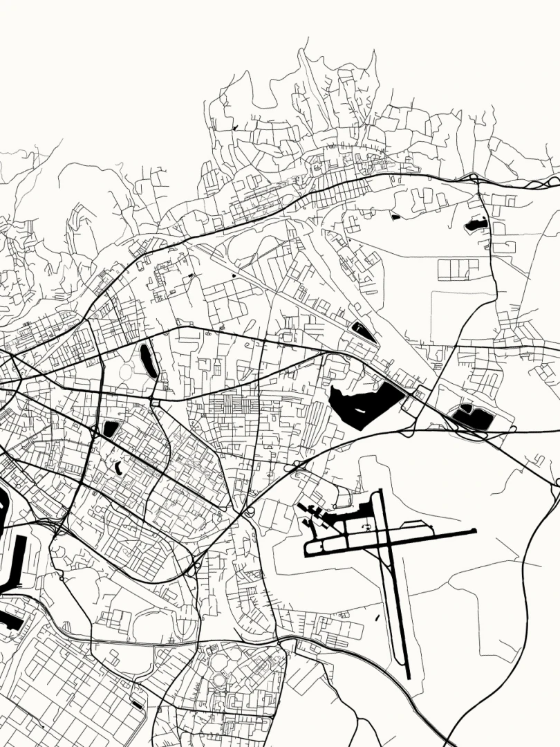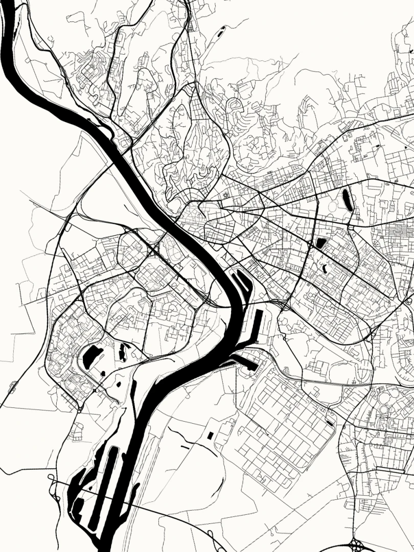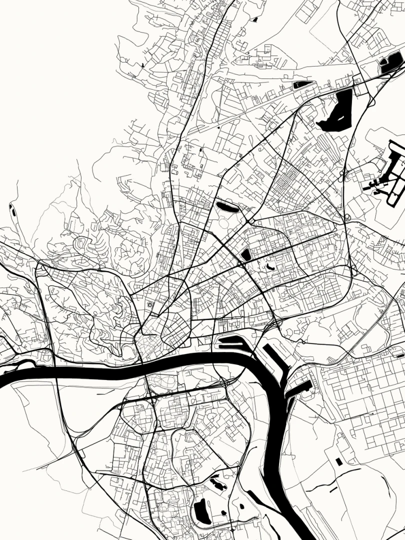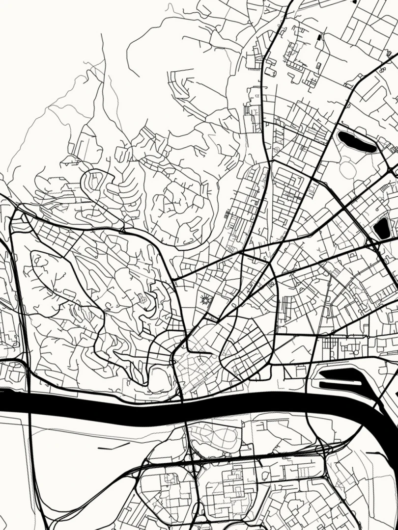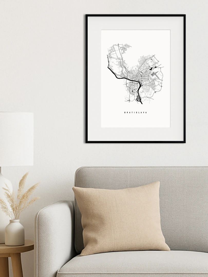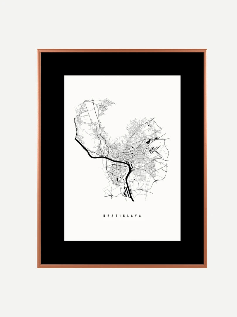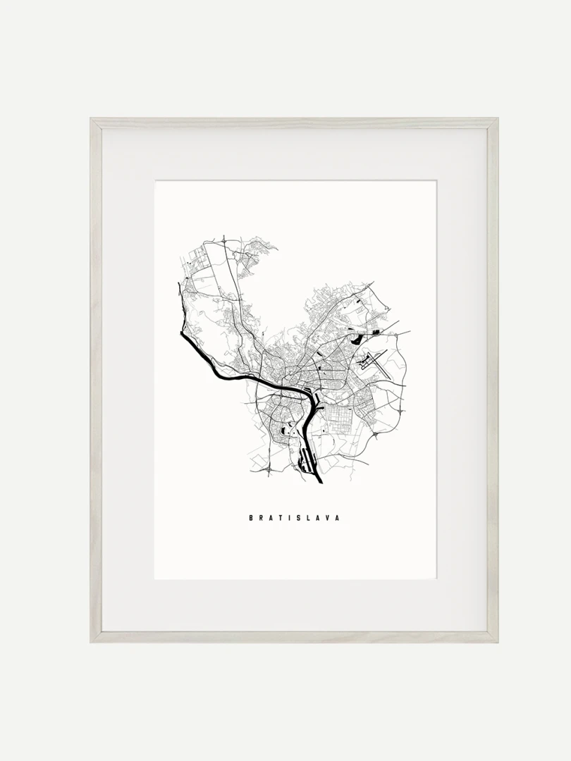 This print features a meticulously detailed map, showcasing the complex street patterns and geographical contours that define Slovakia's capital. Rendered in a crisp, black ink on high-quality paper, the design combines aesthetic appeal with informative precision, making it a perfect blend for both art enthusiasts and cartography aficionados.
