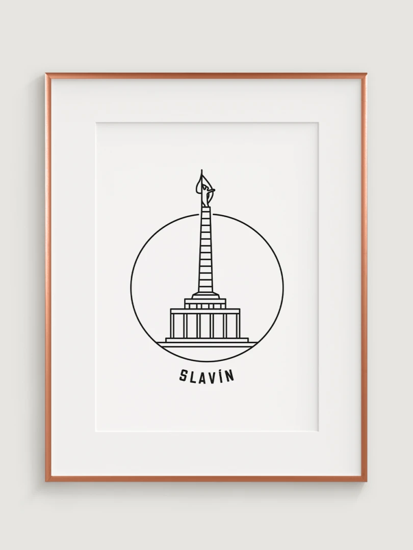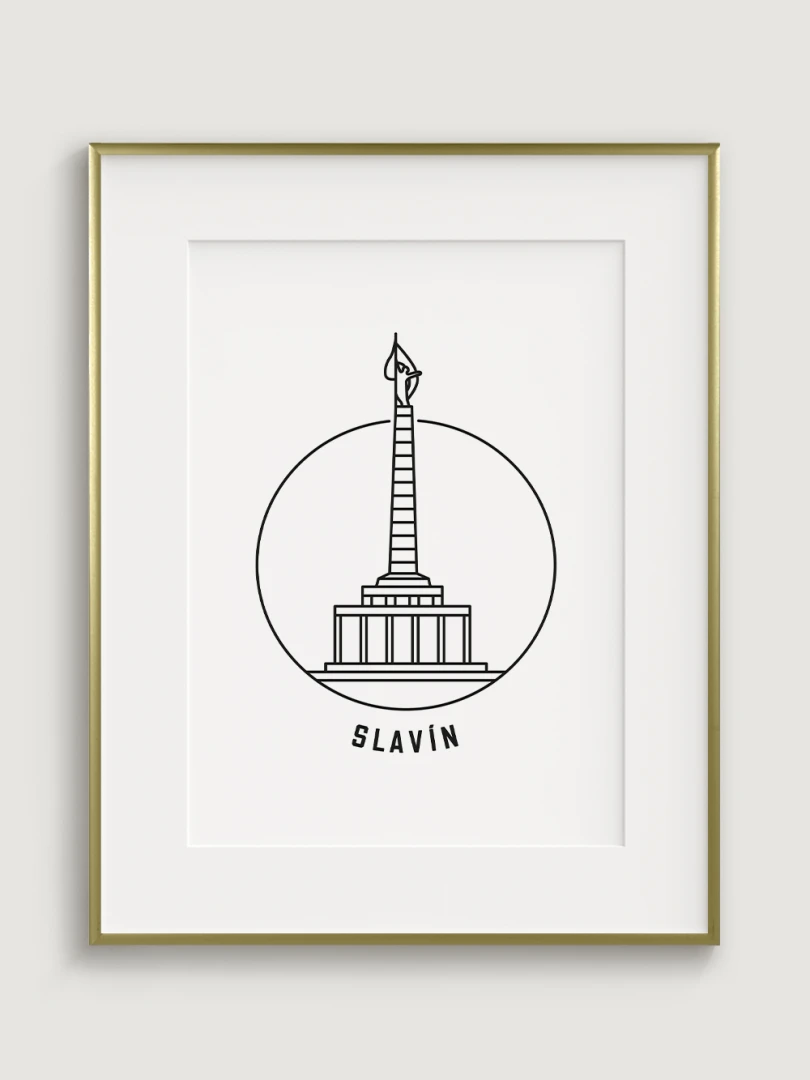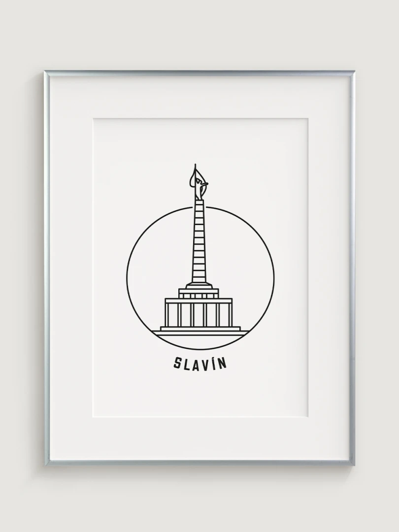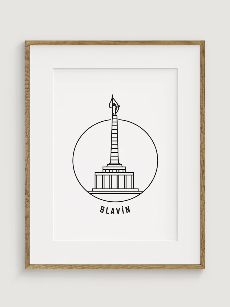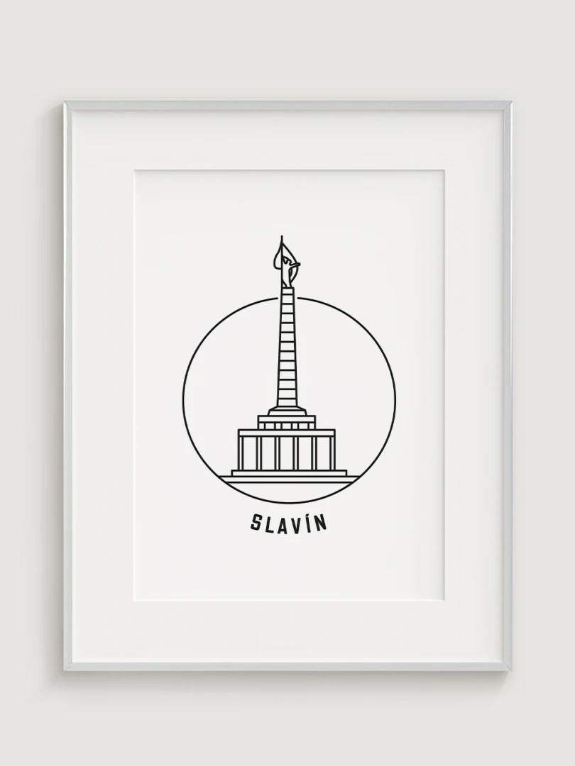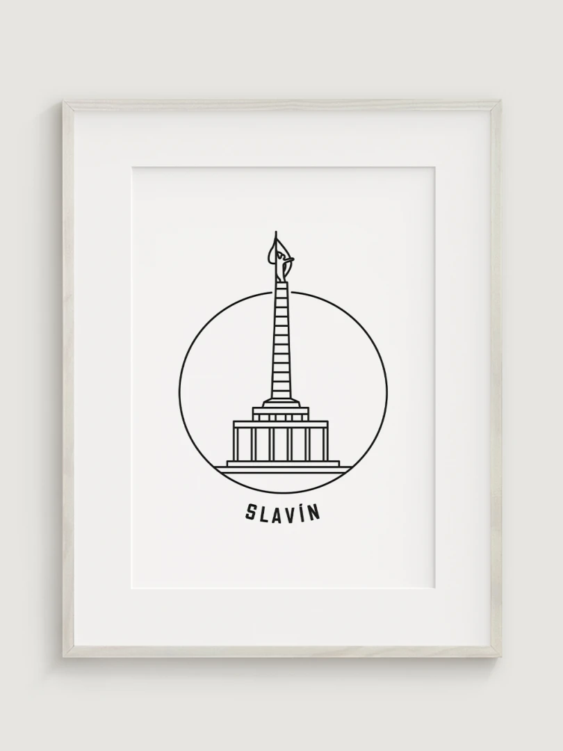 This piece captures the towering monument's elegant silhouette within a simple, yet striking circular frame, embodying a modern take on this historic site. Crafted with sharp black lines on high-quality paper, the artwork distills the grandeur of Slavín into a minimalist design that focuses on the monument's distinctive obelisk and its symbolic statue. The clean, uncluttered style of this print makes it an ideal choice for those who appreciate art that combines historical significance with contemporary aesthetics.